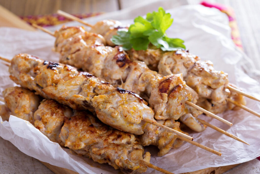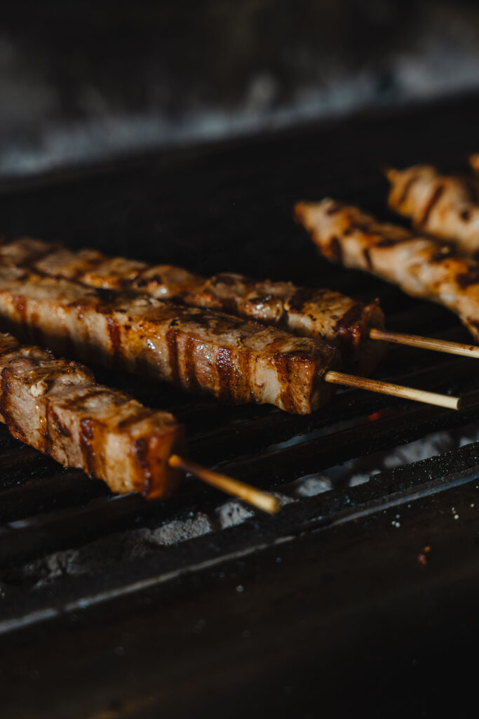 (Handmade Kontosouvli – pork or chicken- sliced pieces/rings of fresh meat on the spit with local herbs and spices)