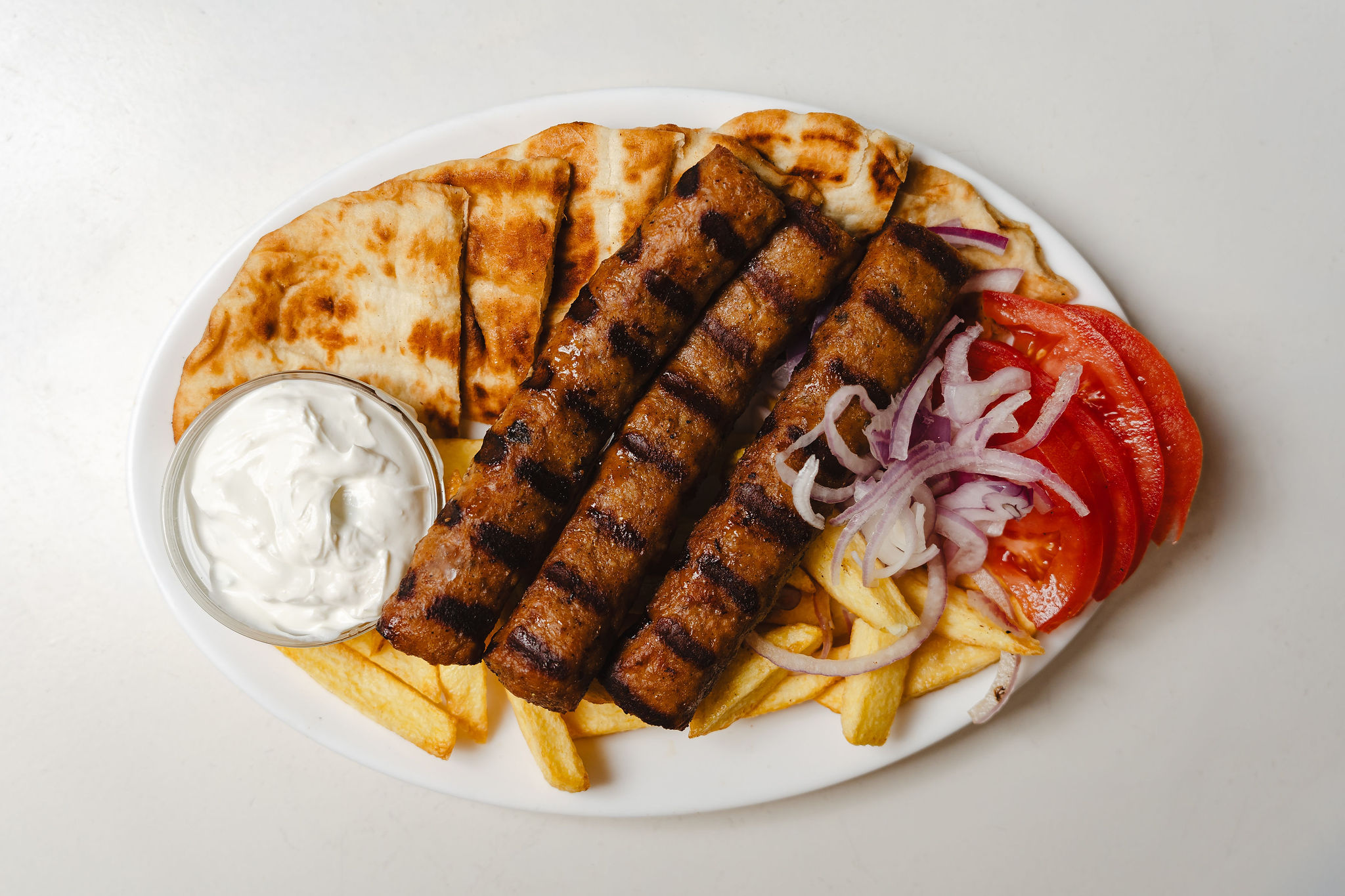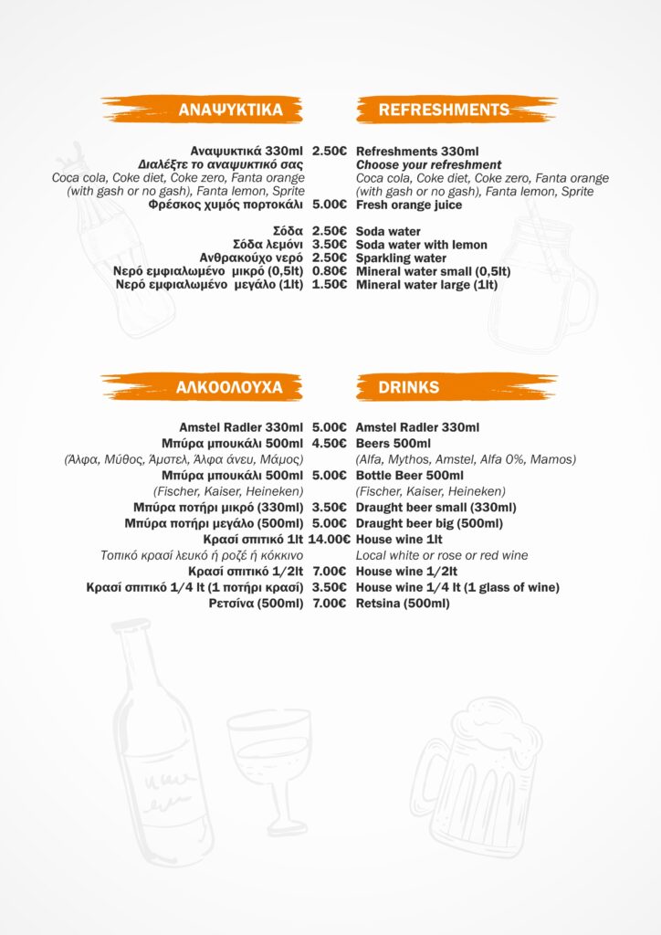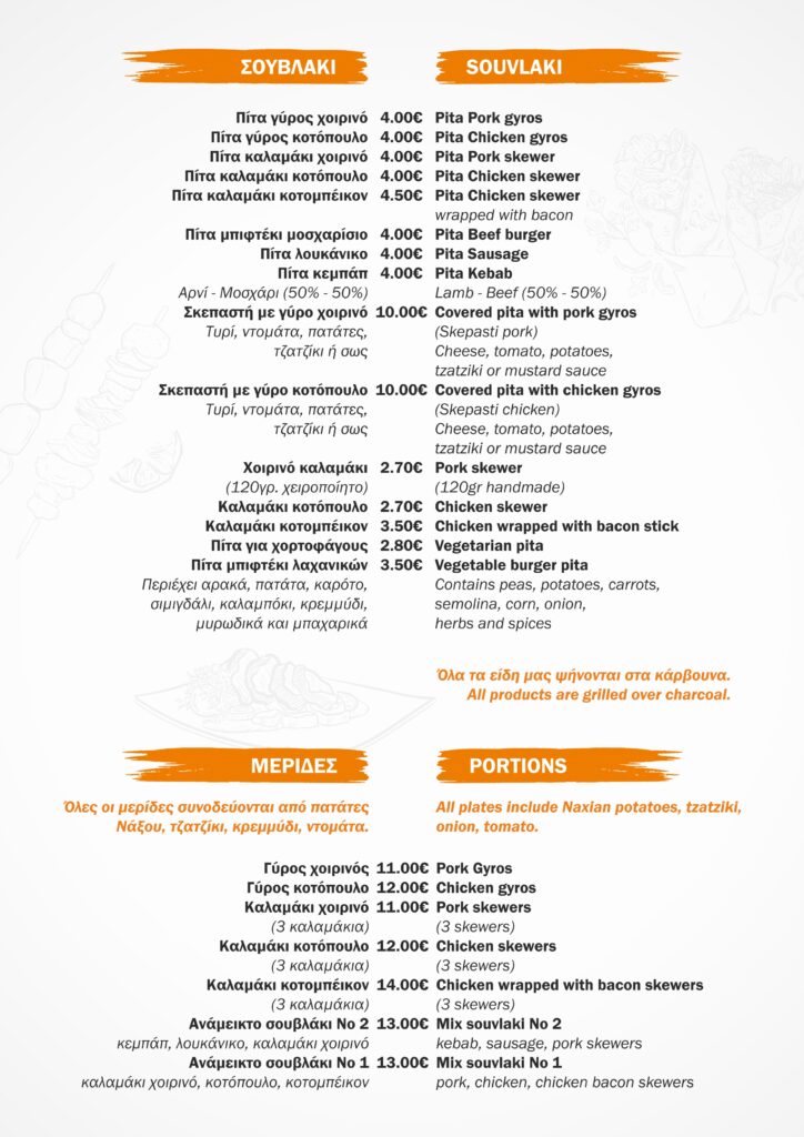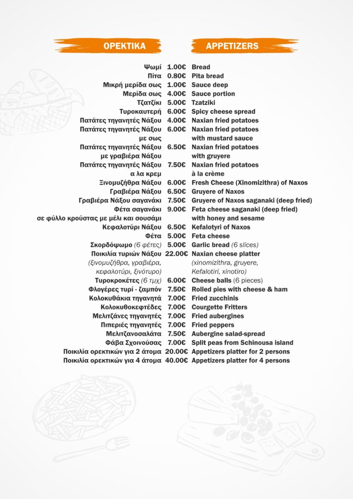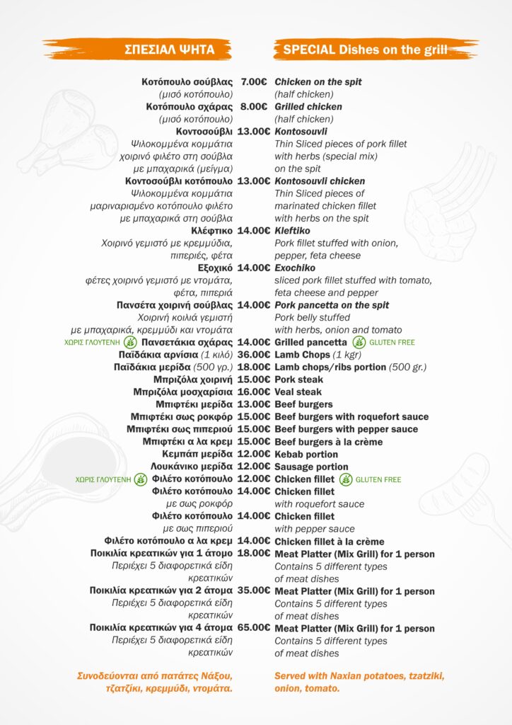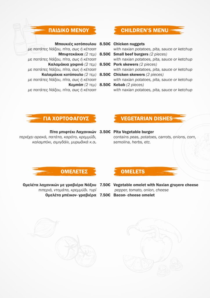All dishes are served with fresh local Naxos potatoes, tomatoes, onions and homemade tzatziki on the side.