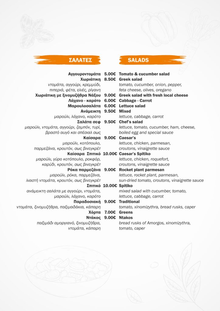 €8,50 (Fresh tomato, cucumber, onions, peppers, Feta or fresh Local Cheese, olives, olive oil and oregano)