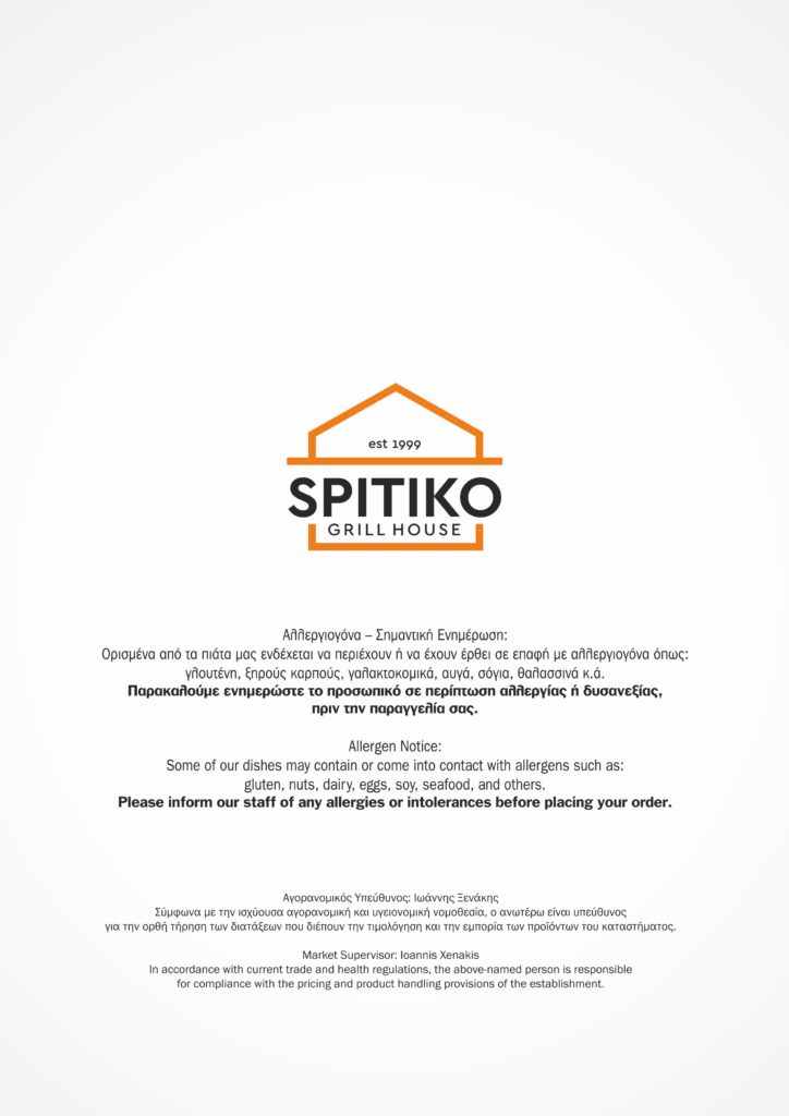 Our opening times meet your demands. Be it in the morning for a coffee and a typical Mediterranean breakfast, at lunch time for a healthy meal, be it in the evening for a cozy Greek dinner in good company with friends, or at night, for just a tasty bite to eat, SPITIKO Restaurant – Grill is always the right place to go.